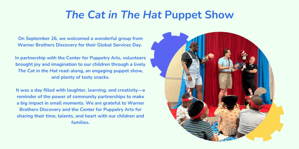 On September 26, we had the joy of welcoming a team from Warner Brothers Discovery as part of their Global Services Day. Their afternoon visit was made extra special through a partnership with the Center for Puppetry Arts, creating a time filled with imagination, laughter, and connection. The highlight of the afternoon was a lively…